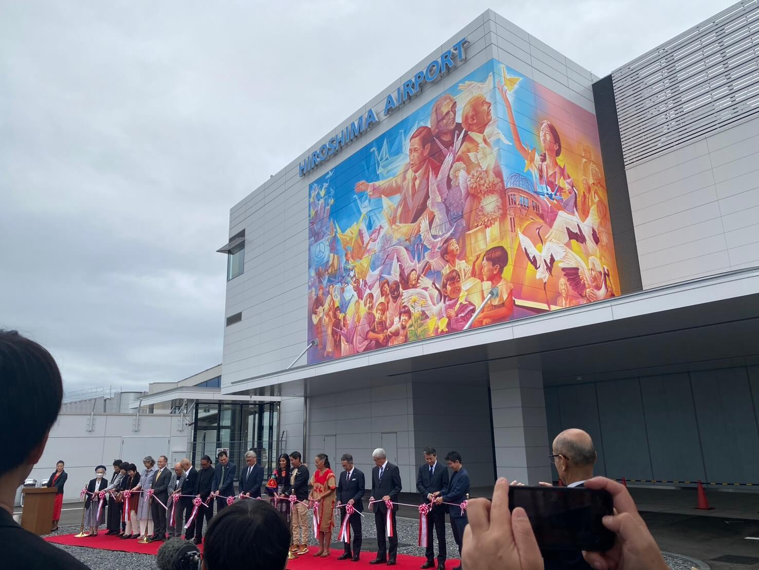 2025年10月15日、広島空港に、「核兵器のない世界」への願いを込めた巨大壁画が完成し、作者や被爆者の方々が出席する完成披露式が行われました。