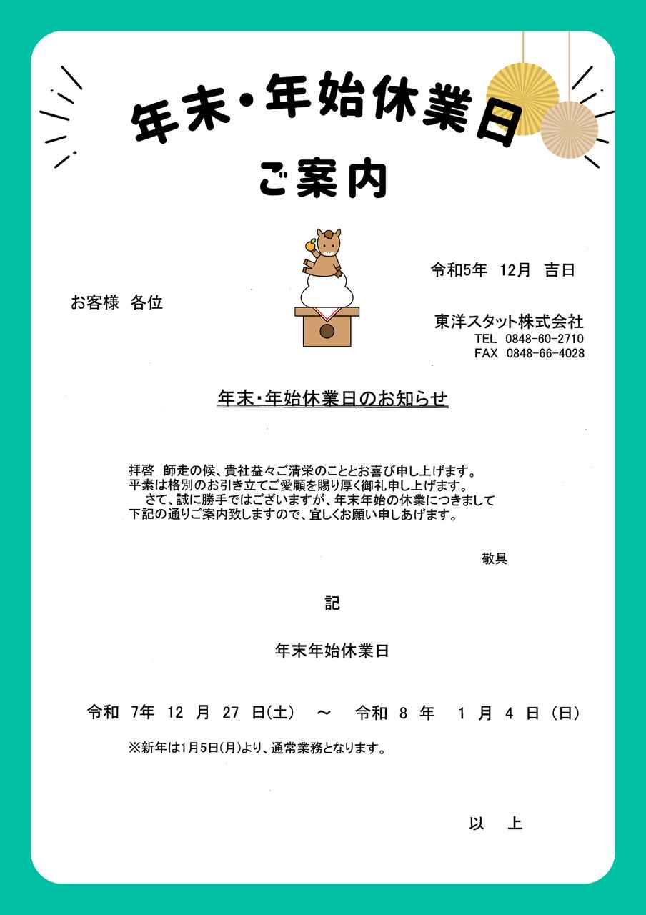 当社の 年末年始休業日につきましては、別添のご案内画像をご確認ください。